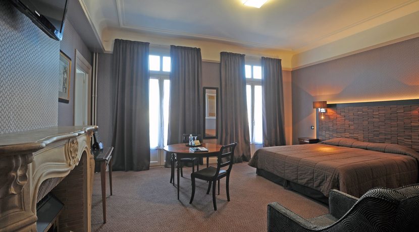 Salle de bain Our Superior Double rooms are at least 20m² with a view on the Place Maréchal Leclerc, in front of the Train Station. A desk, a cupboard and a Queen Size bed make it a very comfortable room. You can request one large bed or twin beds at the booking.